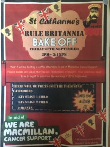27th September– St. Catharine’s School Bake Off competition! Please bring all bakes in to school on the morning of 27th ready for judging. Cakes will be sold in the hall from 2pm. All donations will be sent to the McMillan Cancer Support charity.